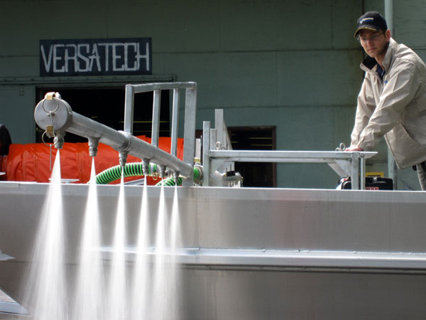 Versatech’s Dispersant Spray System is an extremely useful and valuable resource during an emergency spill response. The high flow pump and eductor systems allows up to 15 m3/hr of dispersant to be sprayed onto an oil spill. Extra long 6 m spray arms allow a large area of oil to be sprayed with dispersant. An all aluminum construction limits corrosion in all water conditions. The dispersant system is powered by a high efficiency Yanmar L70V pull start diesel motor, and the dispersant spray is pumped by a self priming centrifugal pump. Further specifications can be found in the attached product brochure.
