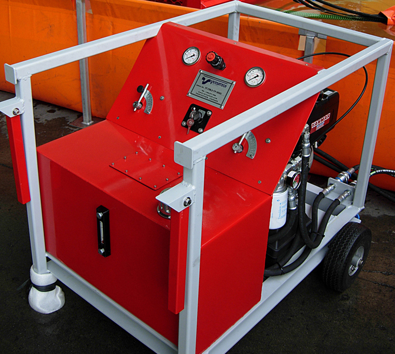 The hydraulic power packs are complete from small air cooled portable units for small RBS skimmers to large 4 or 6 cylinder water cooled engines and come with 2 or more hydraulic circuits for the drive and control or brush speed, pump, thrusters and crane. They can be provided with sound attenuation, fire and explosion resistant or Zone II intrinsically safe engines.